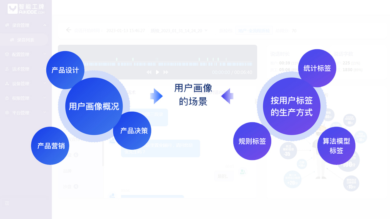 提供智能工牌硬件产品和NLP服务,对员工实战效果进行实时追踪和反馈,生成员工能力画像。让管理者不用随访也能了解现场情况和团队人员能力优劣,及时调整培训策略,同时赋能代理人快速复盘、提升客户洞察能力。缩断培训时间,快速成长。